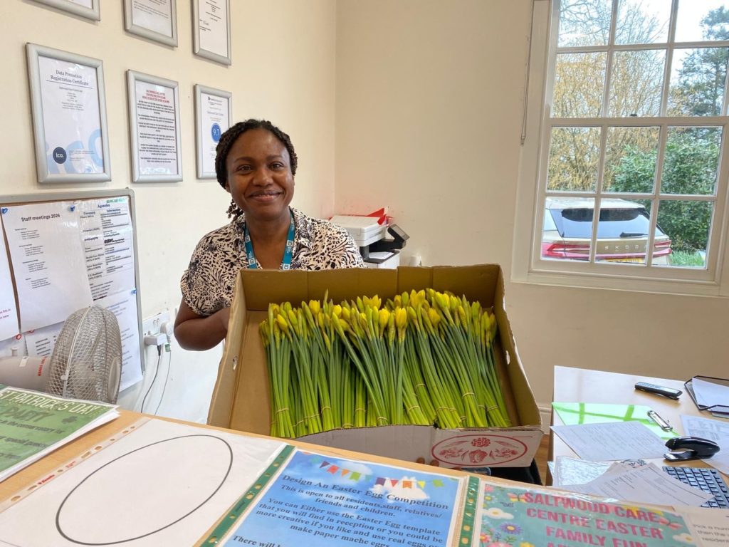On Mothering Sunday, Heidi and Jen at Sterry Funeral Service, Hythe, visited Saltwood Care Centre with a special gesture – bringing beautiful daffodils to brighten up the resident’s days.